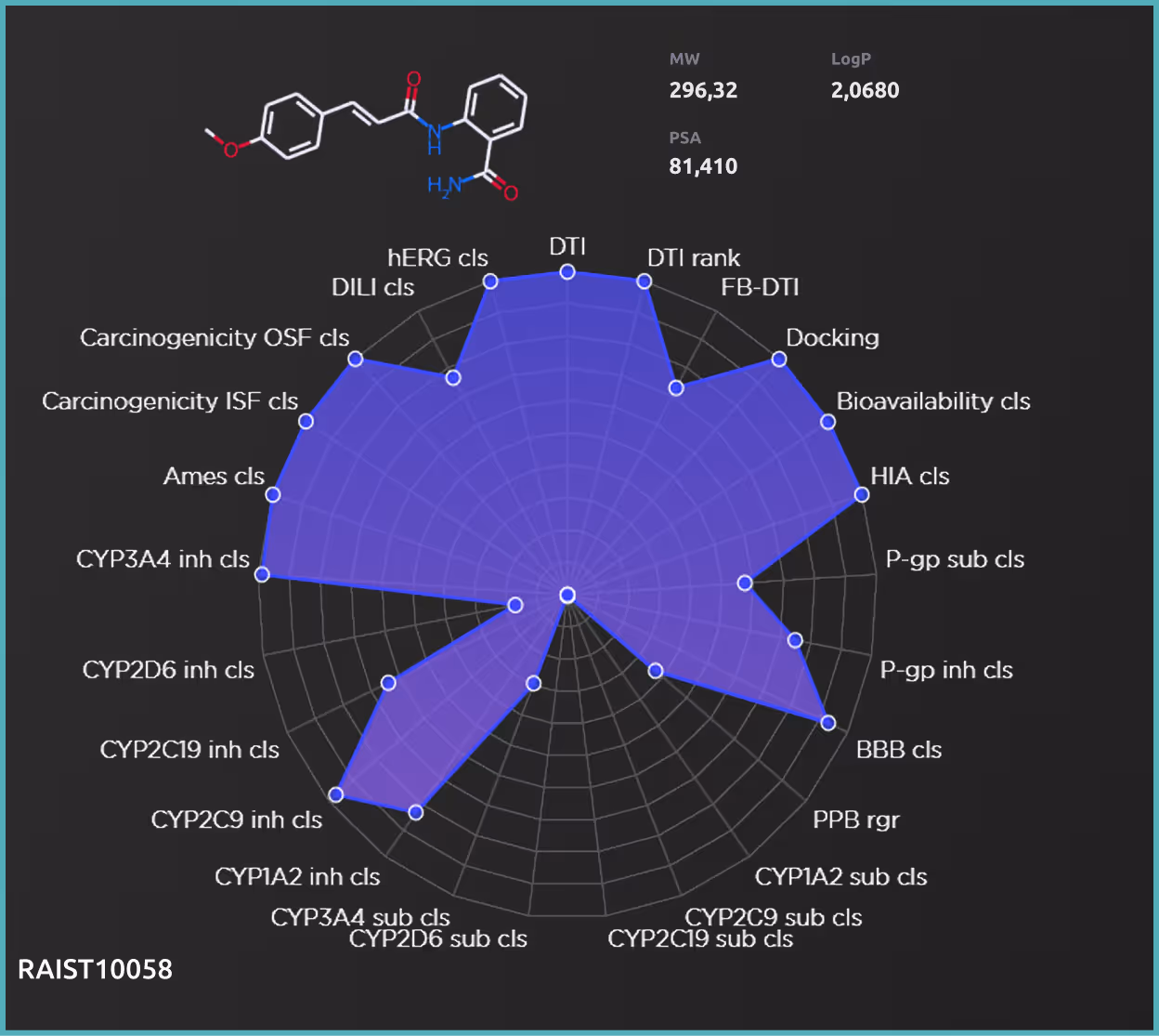 - Optimization loop included docking against target and off-targets with ArtiDock and ADME-Tox prediction with ADMTETIQ