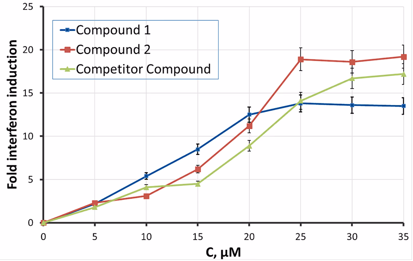 - 2 hits exhibit comparable or superior maximal interferon induction with lower EC50 in comparison to a competing compound.