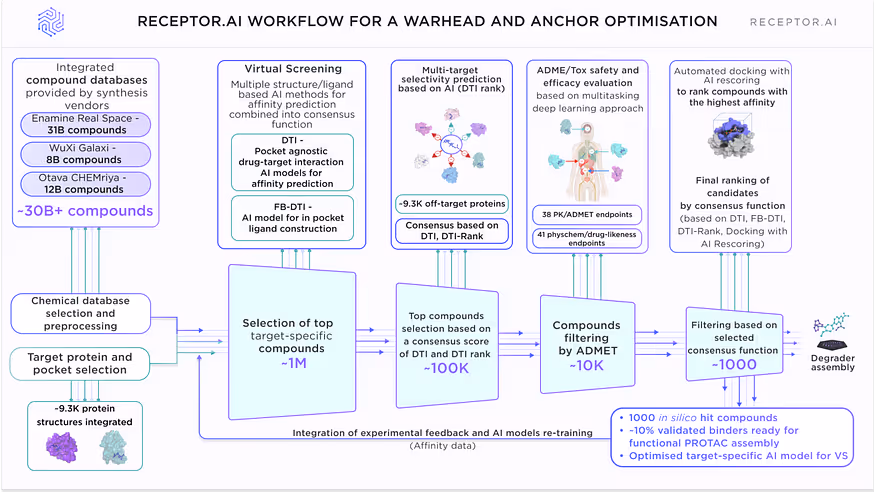 After that, the experimental validation of warhead affinity to POI and the anchor affinity to the ligase is performed, and the results are used for the retraining and fine-tuning of AI models used for subsequent iterations.