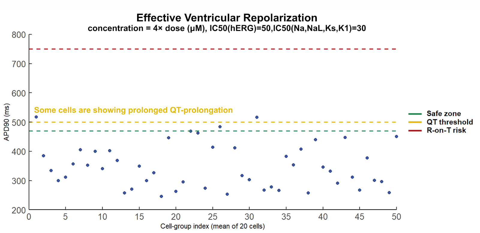 The picture changes decisively once additional ion channels are incorporated. Under the same supra-clinical exposure conditions, a distinct subpopulation emerges with markedly prolonged APD-90 values (Figure 5). Even when the population mean remains within nominal bounds, the appearance of heterogeneity is itself the signal. Cardiac safety is not governed by average behavior; the emergence of even a small subpopulation entering a prolonged repolarization regime indicates that the system has become timing-permissive for proarrhythmic events.