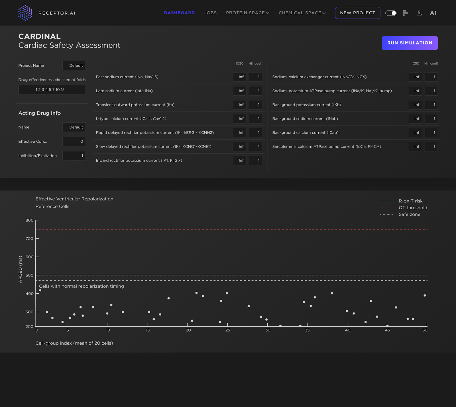 Building on this multi-channel reality, we use an approach designed to reflect it rather than simplify it away. CARDINAL (Cardiac Arrhythmia Risk Determination via Integrated Nonlinear Action-potential Logic) – part of the ADMETiQ model family – is Receptor.AI’s integrated cardiac safety platform that combines AI-based multi-channel IC₅₀ prediction with a mechanistic ventricular action-potential simulator. CARDINAL translates a compound’s full ion-channel inhibition profile into simulated electrophysiology, enabling direct assessment of the net impact on repolarization. In practice, this captures interaction-driven risk patterns that isolated assays cannot resolve and supports earlier, decision-grade prioritization ahead of clinical trials.
