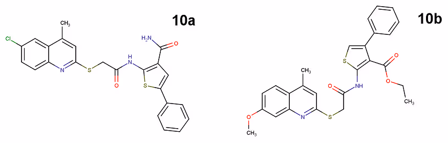 The best dual activity was observed for 2-(quinolin-2-ylsulfanyl)-acetamide. This compound was subject to further modification, and 14 derivatives were synthesised and tested in order to improve its activity. One of the derivatives, called 10a, has shown superior activity. It inhibits MetRS and LeuRS with IC50 values of 33 μM and 23.9 μM, respectively.