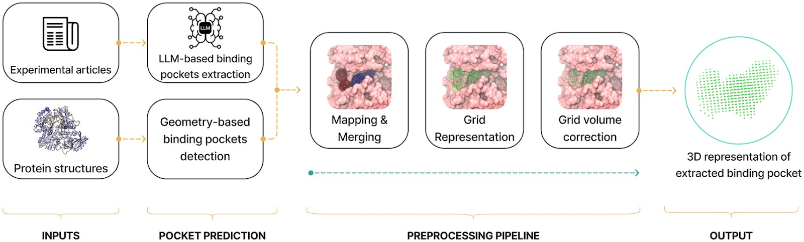 Large language models (LLMs) now offer a way to automate this step. By extracting and structuring binding-site evidence from the literature, LLMs can refine geometry-based predictions into biologically validated pocket models.