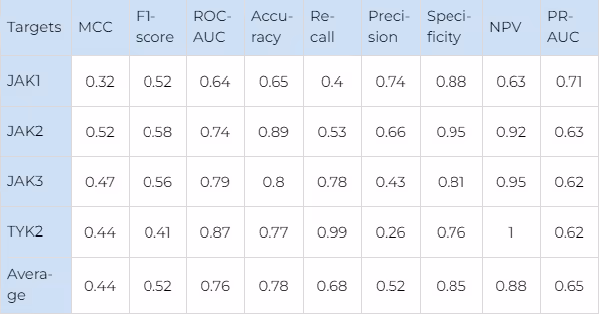 It is clearly seen that the dataset is significantly skewed. The largest number of compounds is found for JAK1, which is the most commonly used as a primary drug target in its family. This creates an inevitable bias towards JAK1 in the AI model. As it is shown in the results section below, the best results are indeed obtained for JAK1 due to the larger number of compounds available for training, while the results for JAK2, JAK3 and TYK2 are expectably worse because of insufficient training data.
