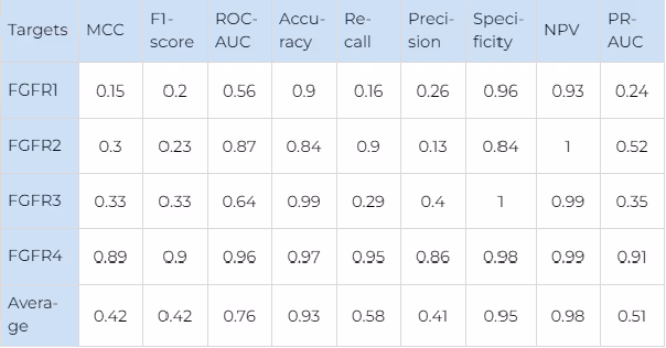 For FGFR2 the similar trend is observed. The smallest number of selective compounds is available, and almost all of them are predicted as such (recall — 0.9). However, the model predicts a significant number of false positives (precision — 0.13). For FGFR3, a comparable number of selective compounds is available, but the recall value is much worse (0.29), while the precision is much better (0.4). This indicates that although the model behaves differently on the targets with such a small number of data points, it still manages to balance the performance metrics in a consistent and predictable way.