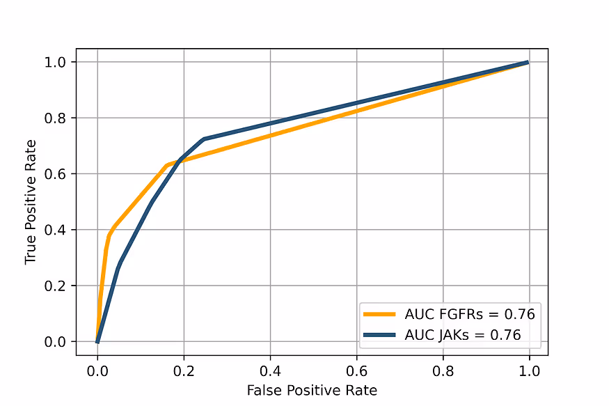 Our model provides very good average characteristics in distinguishing true positives from false positives. The best effectiveness is achieved for the top 20% of samples in the case of JAKs and for the top 10% for FGFRs. The general AUC is 0.76 in both cases, which is a very good value taking into account the data quality.