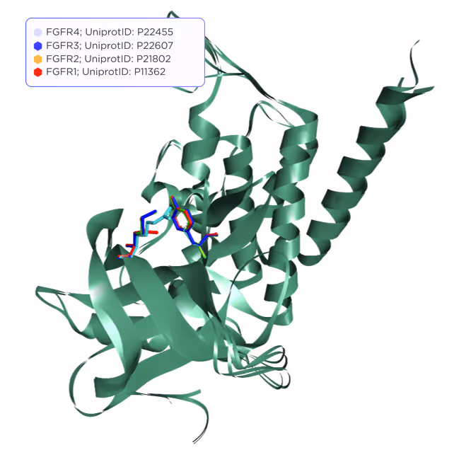 In order to test our platform, we selected subsets of highly similar proteins from two most popular families of drug targets: Janus tyrosine kinases (JAKs) and kinases of Fibroblast growth factor receptors (FGFRs). These proteins are involved in a multitude of diseases, from cancer to cardiovascular diseases, inflammation and metabolic disorders. There is a large number of known ligands with reliable activity data for these proteins, which allows us to perform comprehensive and unbiased benchmarking of our technologies.
