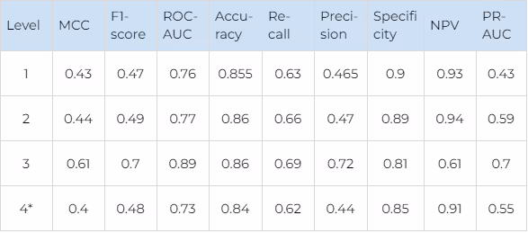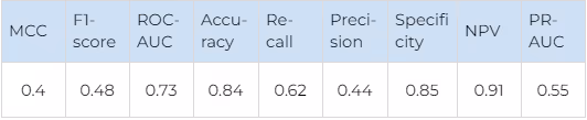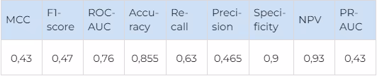 For FDFRs, where very few selective ligands are present, each false negative (selective ligand, which was not found by our model) has more influence on the major metrics (F1 and MCC) than each false positive (non-selective ligand is incorrectly recognised as selective). That is why secondary metrics, such as recall and specificity, should also be used to evaluate the performance.