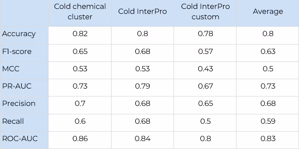 Testing of the model was performed on three test sets: “cold chemical cluster”, “cold InterPro” and “cold InterPro custom”.