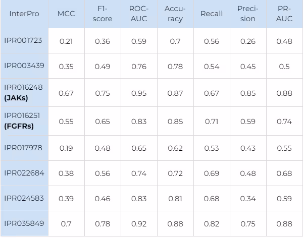Performance metrics of selectivity prediction for JAK and FGFR families are especially good (IPR016248 and IPR016251 in Table 6 respectively).