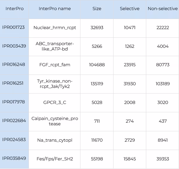 The main performance metrics of selectivity prediction are shown in Table 8 and detailed information about experiment on Cold InterPro custom — in Tables 9 and 10.