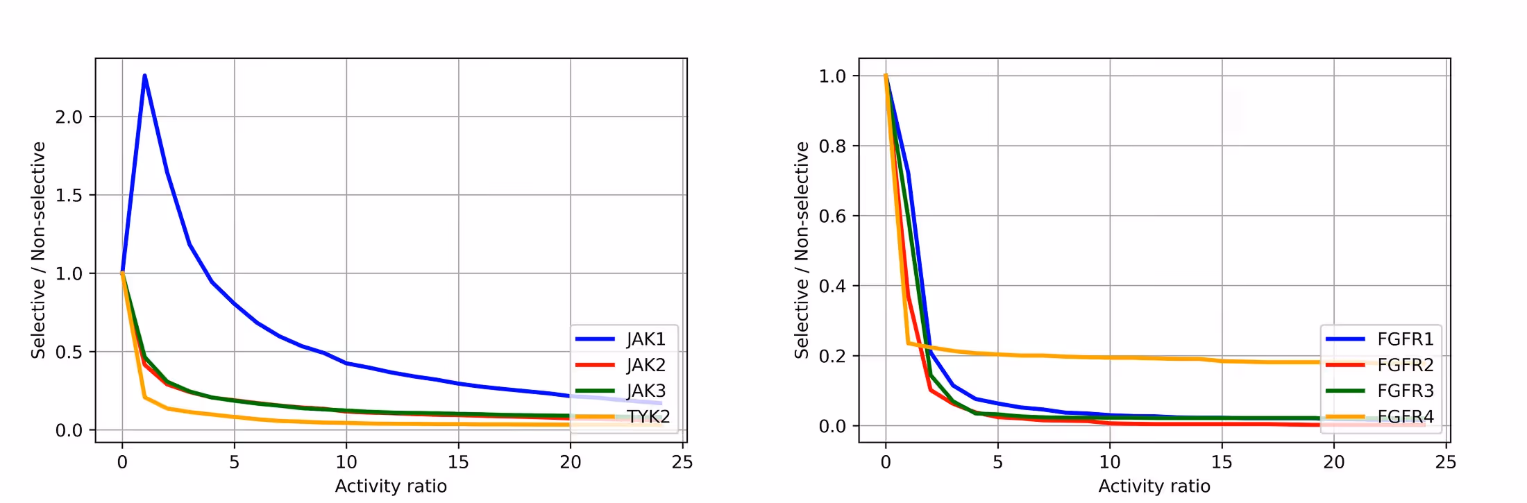 For FGFRs, the number of selective compounds becomes almost constant, starting from an activity ratio of 5. For JAKs, the general picture is similar except for JAK1, which shows a more gradual decrease. In general, an activity ratio of ~5 is a good threshold for establishing the compound’s selectivity for both kinase families.