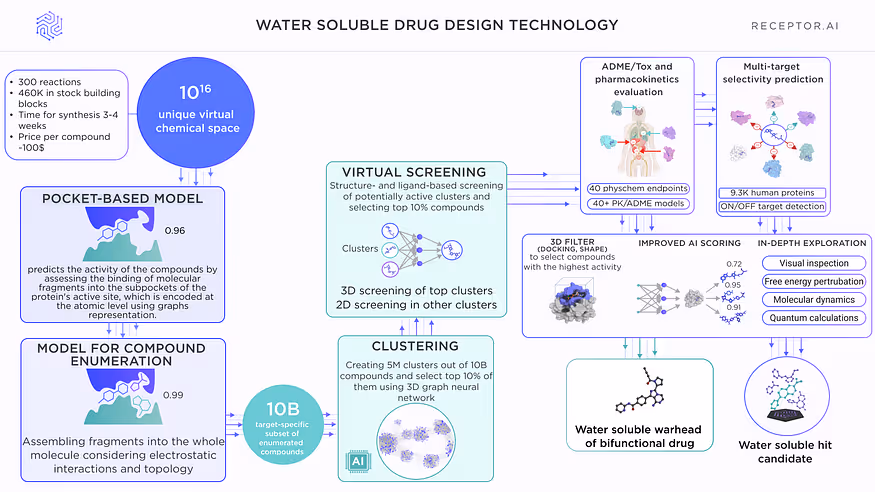Our approach is based on using the capabilities of the Receptor.AI drug discovery platform, which designs two separate active chemical moieties for water-exposed active sites of the membrane protein and for the membrane itself or the intramembrane regions of the protein of interest.