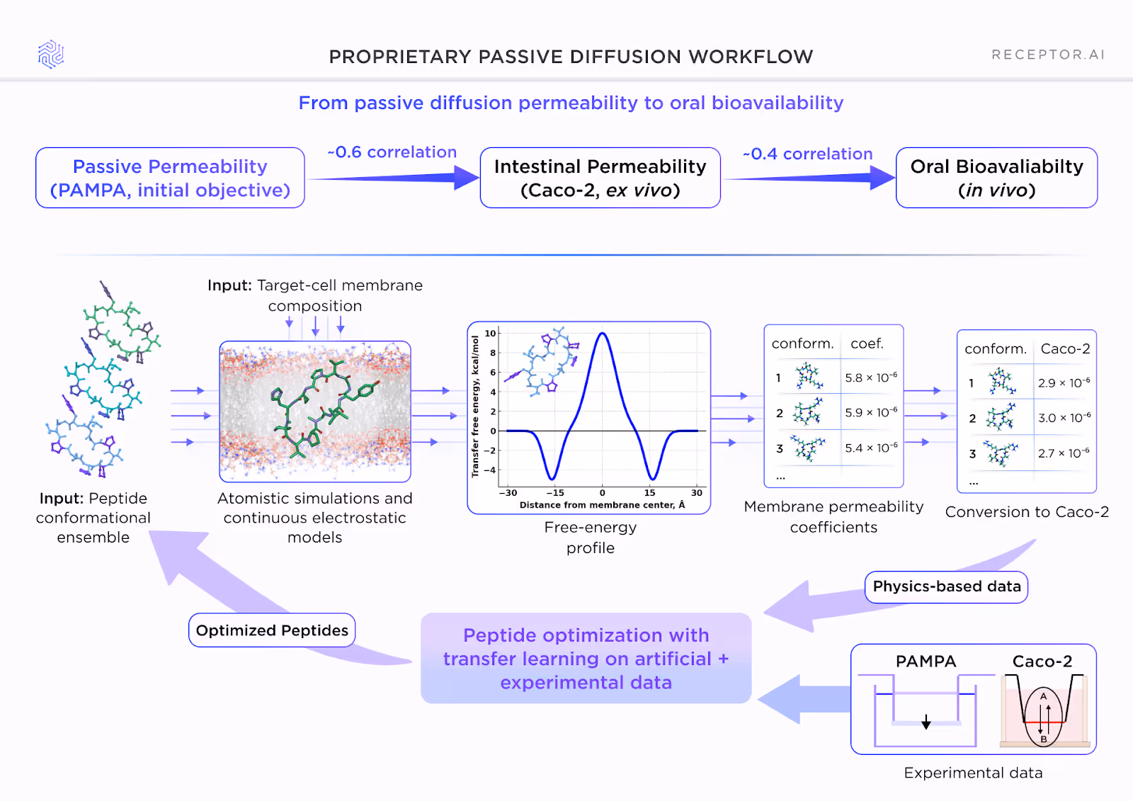 Receptor.AI’s permeability optimization is grounded in a workflow that links physics-based atomistic simulations with experimental readouts. The workflow begins by generating a conformational ensemble of each peptide and simulating its interaction with a target-cell membrane composition. These simulations yield transfer free-energy profiles, which are converted into membrane permeability coefficients and then converted into Caco-2–equivalent values. These and experimental PAMPA and Caco-2 measurements are incorporated through transfer learning, allowing the system to refine its predictions across optimization cycles.
